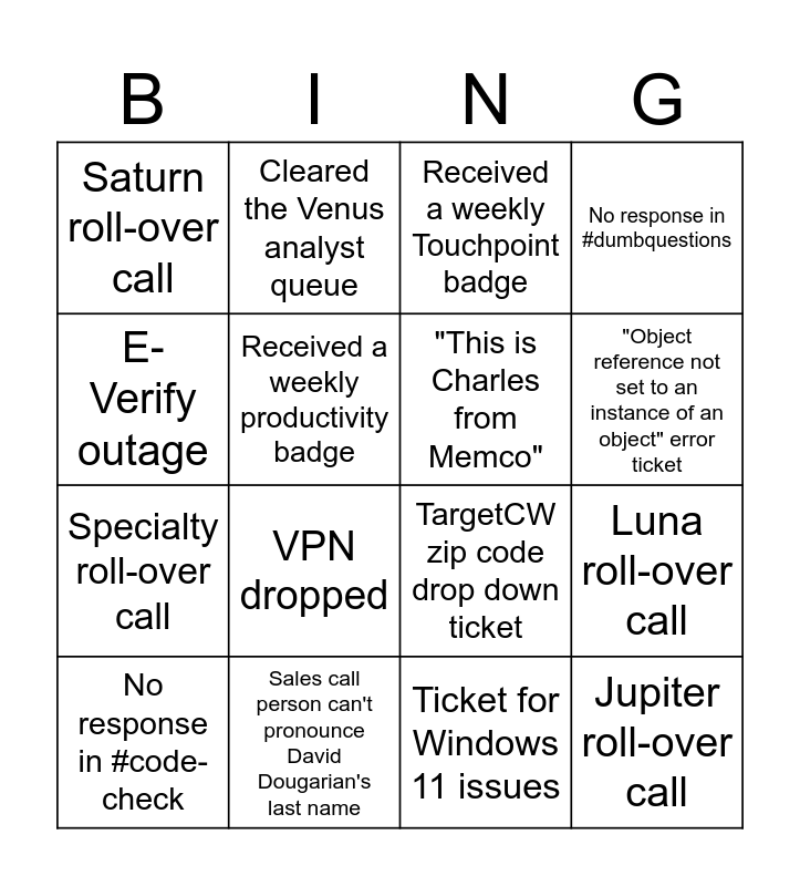 This bingo card has 16 words: Sales call person can't pronounce David Dougarian's last name, Luna roll-over call, Received a weekly Touchpoint badge, Saturn roll-over call, Specialty roll-over call, Cleared the Venus analyst queue, TargetCW zip code drop down ticket, Ticket for Windows 11 issues, E-Verify outage, Received a weekly productivity badge, No response in #code-check, No response in #dumbquestions, VPN dropped, "Object reference not set to an instance of an object" error ticket, "This is Charles from Memco" and Jupiter roll-over call.