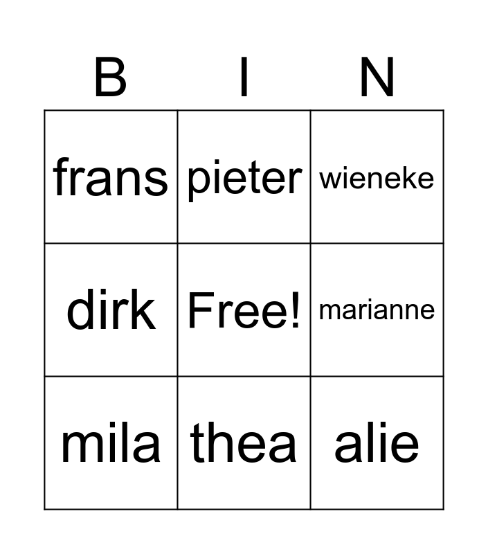 This bingo card has 1 images, a free space and 25 words: twan, thea, gerard, alie, frans, marianne, pieter, veroniek, tim, ilse, marielle, jan, gijs, dirk, jessica, dirk, milou, wieneke, keith, mats, linna, bente, ivar, mila and jonah.