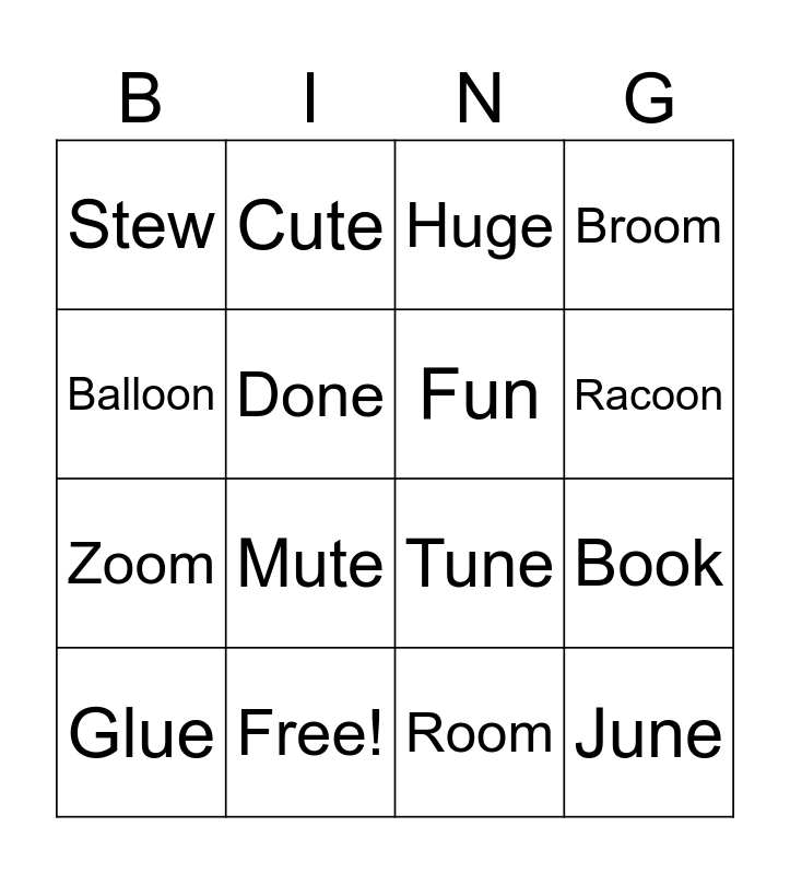 This bingo card has 16 words: Free!, Book, Huge, Stew, Zoom, Cute, Tune, Room, Balloon, Done, Glue, Broom, Mute, Racoon, Fun and June.