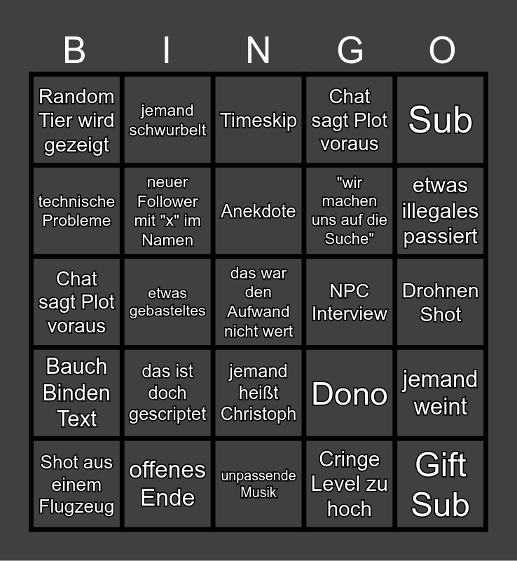 This bingo card has 25 words: das ist doch gescriptet, unpassende Musik, Anekdote, Shot aus einem Flugzeug, Sub, Random Tier wird gezeigt, technische Probleme, jemand schwurbelt, NPC Interview, jemand heißt Christoph, "wir machen uns auf die Suche", Chat sagt Plot voraus, Dono, jemand weint, neuer Follower mit "x" im Namen, Gift Sub, Drohnen Shot, Timeskip, etwas illegales passiert, etwas gebasteltes, das war den Aufwand nicht wert, offenes Ende, Bauch Binden Text, Chat sagt Plot voraus and Cringe Level zu hoch.