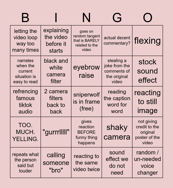This bingo card has a free space and 36 words: Silent for 5 whole seconds, "if i was in that situation", victim blaming, black and white camera filter, shaky camera, TOO. MUCH. YELLING., eyebrow raise, weird mr beast type subtitles (does not count for the intro), flexing, obviously fake laugh, 2 camera filters back to back, actual decent commentary?, random graphic that adds nothing, reading the caption word for word, stock sound effect, letting the video loop way too many times, summarized the video, "gurrrlllll", random / un-needed voice changer, goes on random tangent that is BARELY related to the video, reacting to still image, not giving credit to the original poster of the video, calling someone "bro", repeats what the person said but louder, reacting to the same video twice, explaining the video before it starts, refrencing famous tiktok audio, the channel they credited didn't make the video in the first place, stealing a joke from the comments of the original video, narrates when the current situation is easy to read, talking about her hair for some reason, doing an accent thats not her own, sound effect we do not need, gives reaction BEFORE funny thing happens, "uh ohhhhh" and "uhmmm".