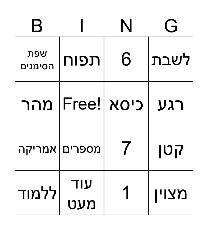 This bingo card has 46 words: בית ספר, ללמוד, חדש, חדשות, בית, אוהל, תפוח, כדורסל, Free!, כדורגל, כיסא, לשבת, מטוס, לטוס, מחשב, להקליד, רגע, עוד מעט, לאט, מהר, קטן, קצר, שפת הסימנים, אמריקה, גרמניה, מספרים, משקפיים, כלב, אישה, מצוין, להבין, מהר, משחק, דיאלוג, לא טוב, טוב, 1, 2, 3, 4, 5, 6, 7, 8, 9 and 10.
