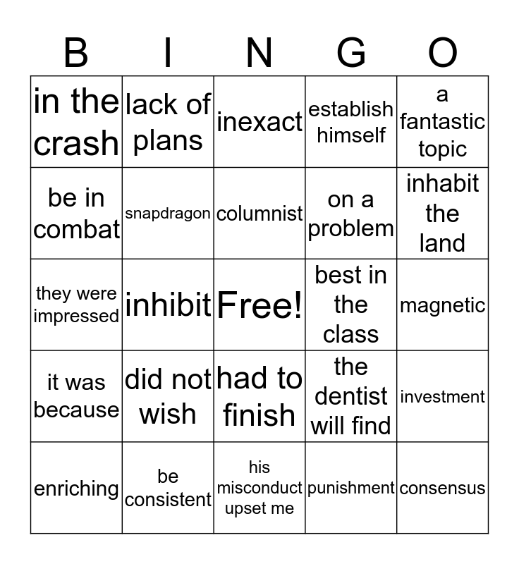 This bingo card has a free space and 24 words: did not wish, be consistent, columnist, enriching, a fantastic topic, in the crash, be in combat, lack of plans, best in the class, had to finish, on a problem, they were impressed, the dentist will find, investment, snapdragon, punishment, magnetic, inexact, inhabit the land, inhibit, consensus, it was because, establish himself and his misconduct upset me.