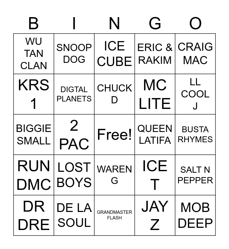 This bingo card has a free space and 24 words: LOST BOYS, DE LA SOUL, CHUCK D, DR DRE, CRAIG MAC, WU TAN CLAN, KRS 1, SNOOP DOG, QUEEN LATIFA, WAREN G, MC LITE, BIGGIE SMALL, ICE T, SALT N PEPPER, DIGTAL PLANETS, JAY Z, BUSTA RHYMES, ICE CUBE, LL COOL J, 2 PAC, MOB DEEP, RUN DMC, ERIC & RAKIM and GRANDMASTER FLASH.