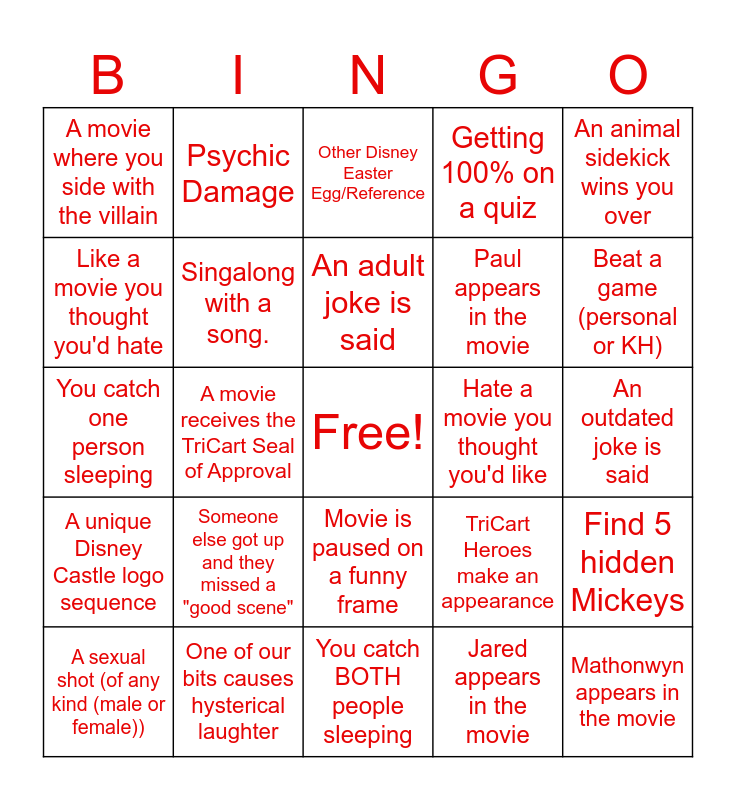 This bingo card has a free space and 24 words: Someone else got up and they missed a "good scene", One of our bits causes hysterical laughter, An adult joke is said, A sexual shot (of any kind (male or female)), An animal sidekick wins you over, A movie where you side with the villain, Like a movie you thought you'd hate, Psychic Damage, Hate a movie you thought you'd like, Movie is paused on a funny frame, Paul appears in the movie, You catch one person sleeping, TriCart Heroes make an appearance, Find 5 hidden Mickeys, Singalong with a song., Jared appears in the movie, An outdated joke is said, Other Disney Easter Egg/Reference, Beat a game (personal or KH), A movie receives the TriCart Seal of Approval, Mathonwyn appears in the movie, A unique Disney Castle logo sequence, Getting 100% on a quiz and You catch BOTH people sleeping.