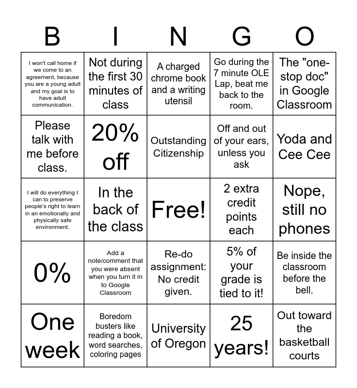 This bingo card has a free space and 29 words: One week, Do your best to learn!, In the back of the class, Communicate! Be real! Just talk to Ms. T and be a mature communicator., I won't call home if we come to an agreement, because you are a young adult and my goal is to have adult communication., A charged chrome book and a writing utensil, 20% off, Add a note/comment that you were absent when you turn it in to Google Classroom, 2 extra credit points each, Boredom busters like reading a book, word searches, coloring pages, Nope, still no phones, Out toward the basketball courts, University of Oregon, 25 years!, Yoda and Cee Cee, 50%off, Re-do assignment: No credit given., 0%, The "one-stop doc" in Google Classroom, I will do everything I can to preserve people’s right to learn in an emotionally and physically safe environment., 5% of your grade is tied to it!, Unsafe, Absolute Refusal, Vicious, Deceitful, Unsightly, Destructive, or there is an Unapproved Exit., Off and out of your ears, unless you ask, Please talk with me before class., Go during the 7 minute OLE Lap, beat me back to the room., Not during the first 30 minutes of class, Be inside the classroom before the bell., Outstanding Citizenship and Juniors!.
