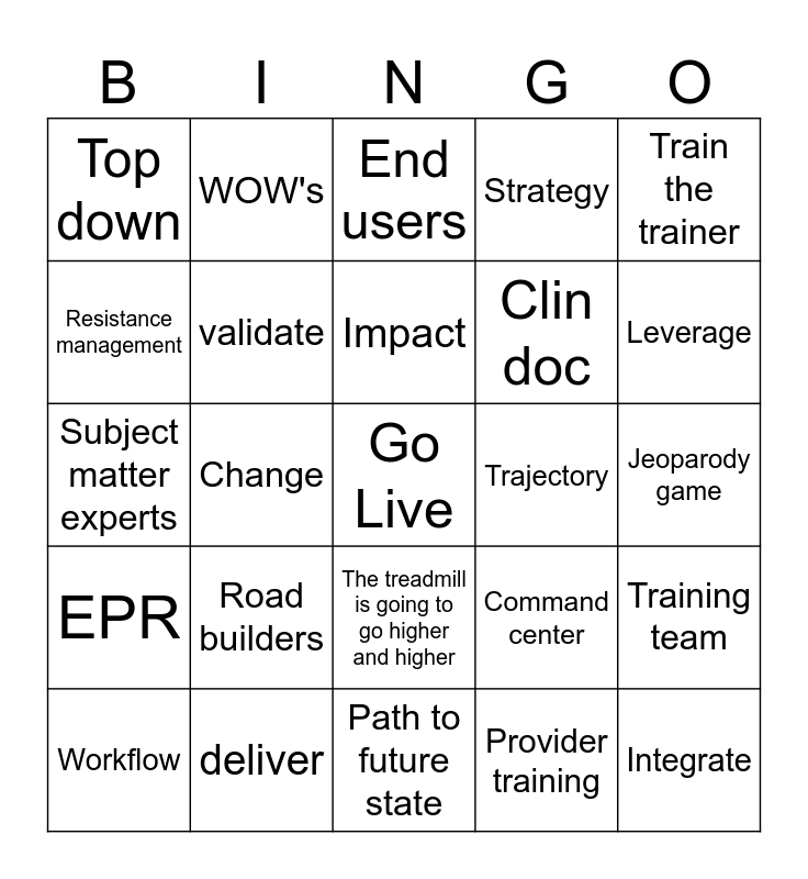 This bingo card has 32 words: Provider training, Command center, Change, CPOE, EPR, validate, Train the trainer, Training team, WOW's, Integrate, Impact, End users, Resistance management, Visible leadership, Trajectory, "Well of despair", Workflow, Subject matter experts, The treadmill is going to go higher and higher, Road builders, Command center, "The runway is short...very short", Jeoparody game, deliver, Go Live, Strategy, Clin doc, Resistance management, Top down, Path to future state, Down time and Leverage.