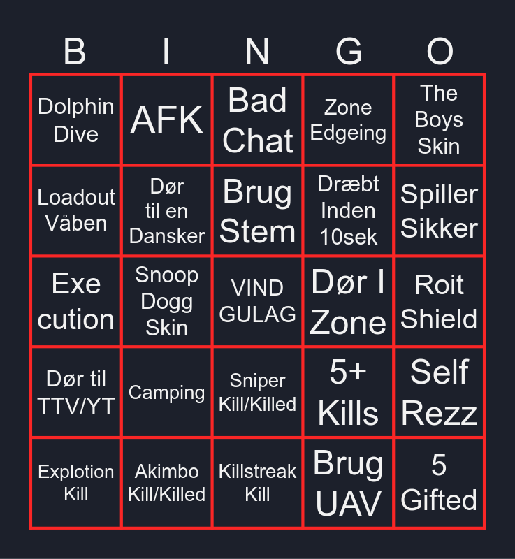 This bingo card has a free space and 24 words: Camping, Akimbo Kill/Killed, Brug Stem, Explotion Kill, The Boys Skin, Dolphin Dive, Loadout Våben, AFK, Dør I Zone, Sniper Kill/Killed, Dræbt Inden 10sek, Exe cution, 5+ Kills, Self Rezz, Dør til en Dansker, Brug UAV, Roit Shield, Bad Chat, Spiller Sikker, Snoop Dogg Skin, 5 Gifted, Dør til TTV/YT, Zone Edgeing and Killstreak Kill.