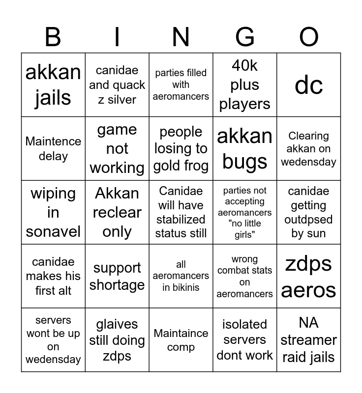 This bingo card has a free space and 24 words: support shortage, glaives still doing zdps, people losing to gold frog, servers wont be up on wedensday, dc, akkan jails, Maintence delay, canidae and quack z silver, parties not accepting aeromancers "no little girls", all aeromancers in bikinis, akkan bugs, wiping in sonavel, wrong combat stats on aeromancers, zdps aeros, game not working, isolated servers dont work, canidae getting outdpsed by sun, parties filled with aeromancers, Clearing akkan on wedensday, Akkan reclear only, NA streamer raid jails, canidae makes his first alt, 40k plus players and Maintaince comp.