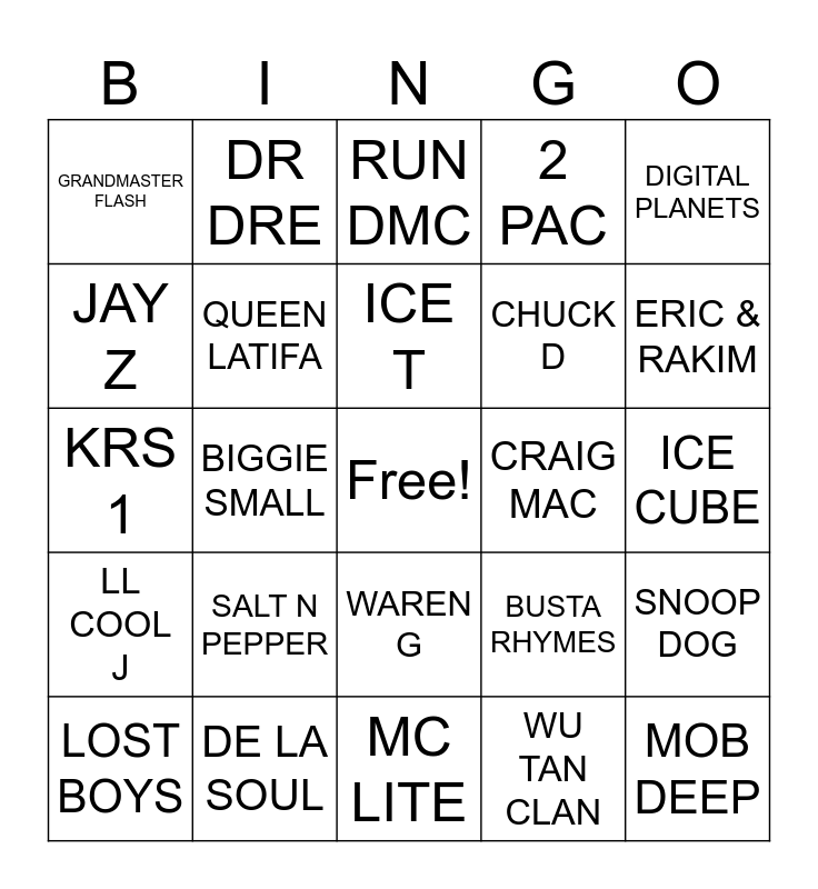This bingo card has a free space and 24 words: SALT N PEPPER, DE LA SOUL, ICE T, LOST BOYS, DIGITAL PLANETS, GRANDMASTER FLASH, JAY Z, DR DRE, CRAIG MAC, WAREN G, CHUCK D, KRS 1, BUSTA RHYMES, SNOOP DOG, QUEEN LATIFA, WU TAN CLAN, ICE CUBE, RUN DMC, ERIC & RAKIM, BIGGIE SMALL, MOB DEEP, LL COOL J, 2 PAC and MC LITE.