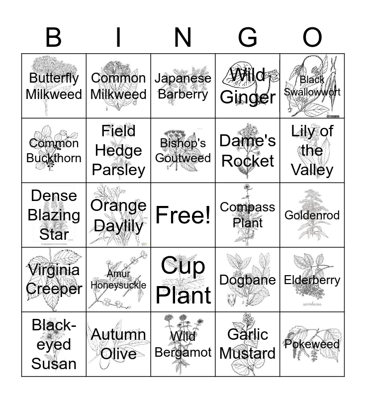 This bingo card has 24 images, a free space and 24 words: Amur Honeysuckle, Autumn Olive, Bishop's Goutweed, Black-eyed Susan, Black Swallowwort, Butterfly Milkweed, Common Buckthorn, Common Milkweed, Compass Plant, Cup Plant, Dame's Rocket, Dense Blazing Star, Dogbane, Elderberry, Field Hedge Parsley, Garlic Mustard, Goldenrod, Japanese Barberry, Lily of the Valley, Orange Daylily, Pokeweed, Virginia Creeper, Wild Ginger and Wild Bergamot.