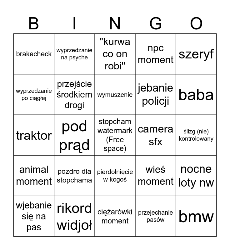 This bingo card has a free space and 24 words: pozdro dla stopchama, rikord widjoł, wymuszenie, wjebanie się na pas, szeryf, brakecheck, wyprzedzanie po ciągłej, wyprzedzanie na psyche, camera sfx, pierdolnięcie w kogoś, jebanie policji, traktor, wieś moment, nocne loty nw, przejście środkiem drogi, przejechanie pasów, ślizg (nie) kontrolowany, "kurwa co on robi", baba, pod prąd, bmw, animal moment, npc moment and ciężarówki moment.