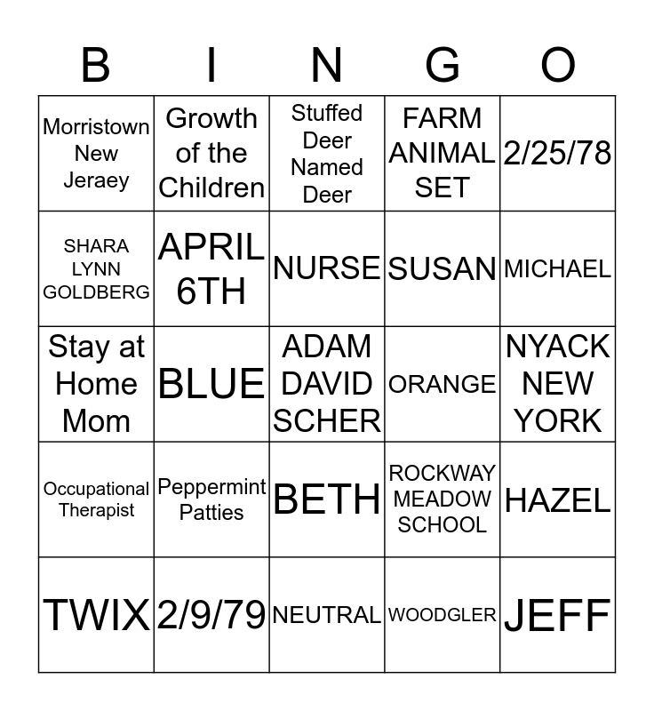 This bingo card has a free space and 24 words: Peppermint Patties, 2/9/79, NURSE, TWIX, 2/25/78, Morristown New Jeraey, SHARA LYNN GOLDBERG, Growth of the Children, ORANGE, BETH, SUSAN, Stay at Home Mom, ROCKWAY MEADOW SCHOOL, HAZEL, APRIL 6TH, WOODGLER, NYACK NEW YORK, Stuffed Deer Named Deer, MICHAEL, BLUE, JEFF, Occupational Therapist, FARM ANIMAL SET and NEUTRAL.