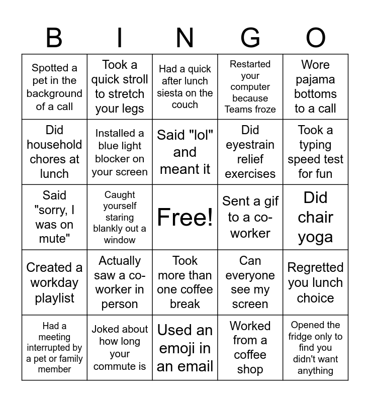 This bingo card has a free space and 24 words: Actually saw a co-worker in person, Joked about how long your commute is, Said "lol" and meant it, Had a meeting interrupted by a pet or family member, Wore pajama bottoms to a call, Spotted a pet in the background of a call, Did household chores at lunch, Took a quick stroll to stretch your legs, Sent a gif to a co-worker, Took more than one coffee break, Did eyestrain relief exercises, Said "sorry, I was on mute", Can everyone see my screen, Regretted you lunch choice, Installed a blue light blocker on your screen, Worked from a coffee shop, Did chair yoga, Had a quick after lunch siesta on the couch, Took a typing speed test for fun, Caught yourself staring blankly out a window, Opened the fridge only to find you didn't want anything, Created a workday playlist, Restarted your computer because Teams froze and Used an emoji in an email.