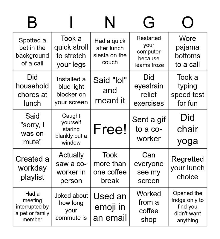This bingo card has a free space and 24 words: Actually saw a co-worker in person, Joked about how long your commute is, Said "lol" and meant it, Had a meeting interrupted by a pet or family member, Wore pajama bottoms to a call, Spotted a pet in the background of a call, Did household chores at lunch, Took a quick stroll to stretch your legs, Sent a gif to a co-worker, Took more than one coffee break, Did eyestrain relief exercises, Said "sorry, I was on mute", Can everyone see my screen, Regretted your lunch choice, Installed a blue light blocker on your screen, Worked from a coffee shop, Did chair yoga, Had a quick after lunch siesta on the couch, Took a typing speed test for fun, Caught yourself staring blankly out a window, Opened the fridge only to find you didn't want anything, Created a workday playlist, Restarted your computer because Teams froze and Used an emoji in an email.
