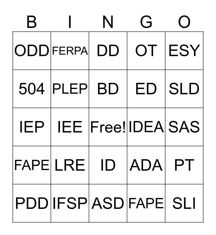 This bingo card has a free space and 24 words: LRE, IFSP, BD, PDD, ESY, ODD, 504, FERPA, IDEA, ID, ED, IEP, ADA, PT, PLEP, FAPE, SAS, DD, SLD, IEE, SLI, FAPE, OT and ASD.
