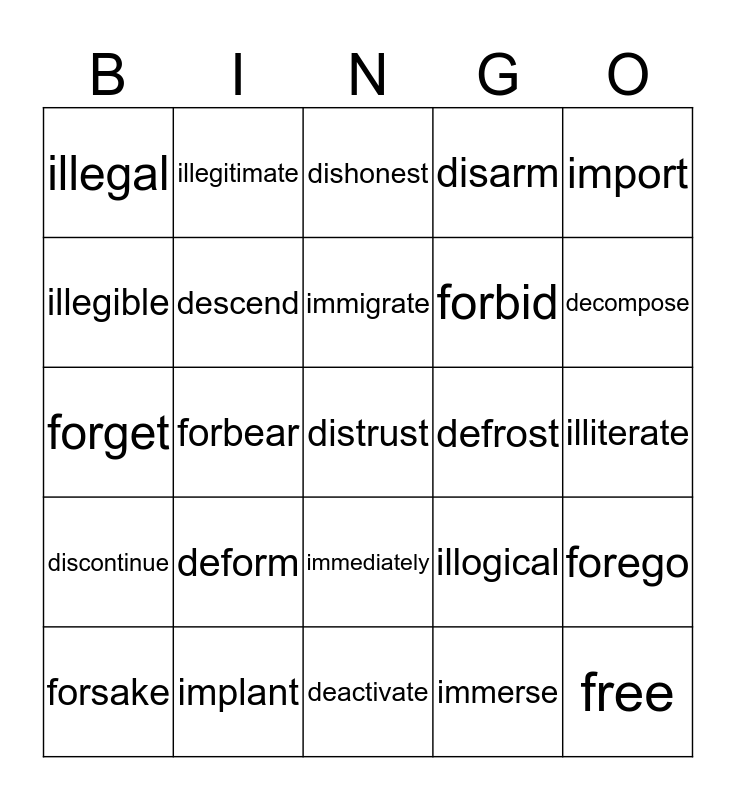 This bingo card has 26 words: immediately, immerse, immigrate, implant, import, illegal, illegible, illegitimate, illiterate, illogical, forbid, forget, forego, forsake, forbear, disagree, disarm, discontinue, dishonest, distrust, decompose, deactivate, defrost, deform, descend and free.