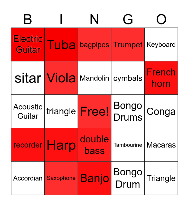 This bingo card has a free space and 24 words: Accordian, Harp, Mandolin, Bongo Drum, Keyboard, Electric Guitar, Tuba, bagpipes, Bongo Drums, Conga, Acoustic Guitar, Viola, Tambourine, Macaras, sitar, Saxophone, Banjo, Trumpet, French horn, recorder, triangle, double bass, cymbals and Triangle.