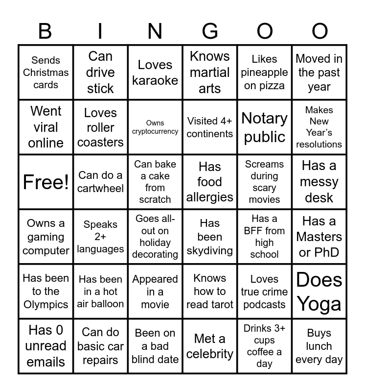 This bingo card has 36 words: Knows how to read tarot, Appeared in a movie, Met a celebrity, Went viral online, Owns a gaming computer, Has food allergies, Loves roller coasters, Been on a bad blind date, Likes pineapple on pizza, Loves true crime podcasts, Makes New Year’s resolutions, Knows martial arts, Does Yoga, Can do a cartwheel, Visited 4+ continents, Sends Christmas cards, Has been to the Olympics, Screams during scary movies, Free!, Loves karaoke, Can bake a cake from scratch, Speaks 2+ languages, Has been skydiving, Goes all-out on holiday decorating, Has a BFF from high school, Can drive stick, Notary public, Can do basic car repairs, Owns cryptocurrency, Moved in the past year, Buys lunch every day, Has 0 unread emails, Has a Masters or PhD, Has a messy desk, Has been in a hot air balloon and Drinks 3+ cups coffee a day.