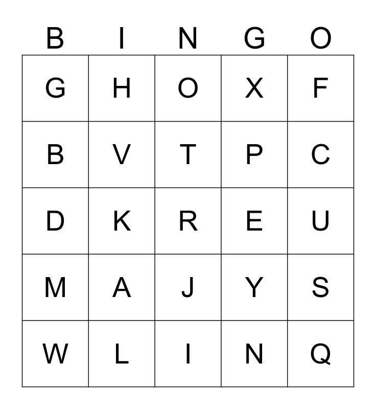 This bingo card has 25 words: A, I, T, W, F, G, B, H, E, J, P, D, Y, S, V, Q, U, O, C, K, R, L, M, X and N.