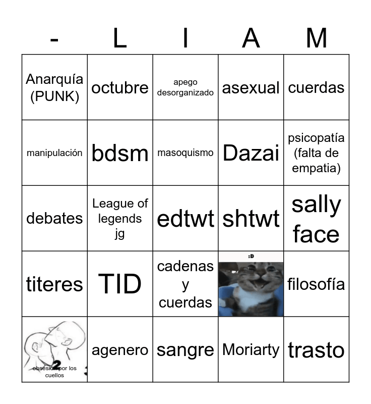 This bingo card has 2 images and 24 words: TID, sangre, masoquismo, obsesión por los cuellos, cuerdas, Anarquía (PUNK), manipulación, octubre, shtwt, cadenas y cuerdas, Dazai, debates, filosofía, bdsm, trasto, sally face, apego desorganizado, psicopatía (falta de empatia), League of legends jg, edtwt, agenero, titeres, asexual and Moriarty.