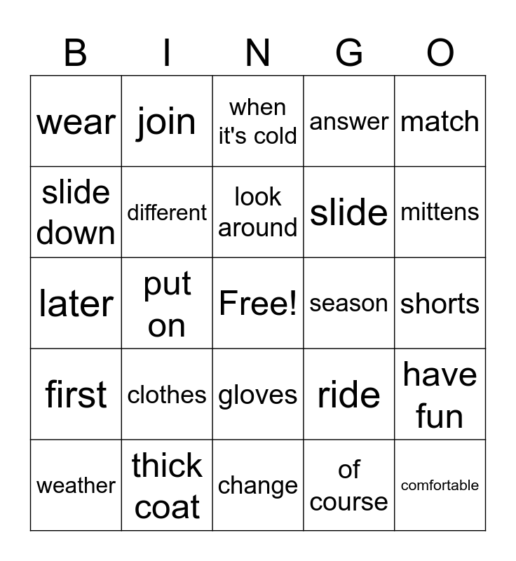 This bingo card has a free space and 29 words: weather, get out, put on, outside, wear, when it's cold, different, clothes, season, thick coat, shorts, comfortable, change, of course, mittens, boxing, gloves, first, match, later, ride, other, slide, slide down, answer, join, have fun, look around and date.