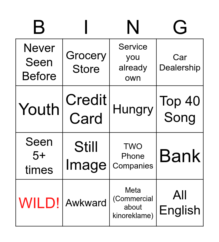 This bingo card has 16 words: Awkward, Bank, Service you already own, Never Seen Before, Seen 5+ times, Grocery Store, TWO Phone Companies, Meta (Commercial about kinoreklame), Youth, Credit Card, WILD!, Car Dealership, Still Image, Top 40 Song, Hungry and All English.