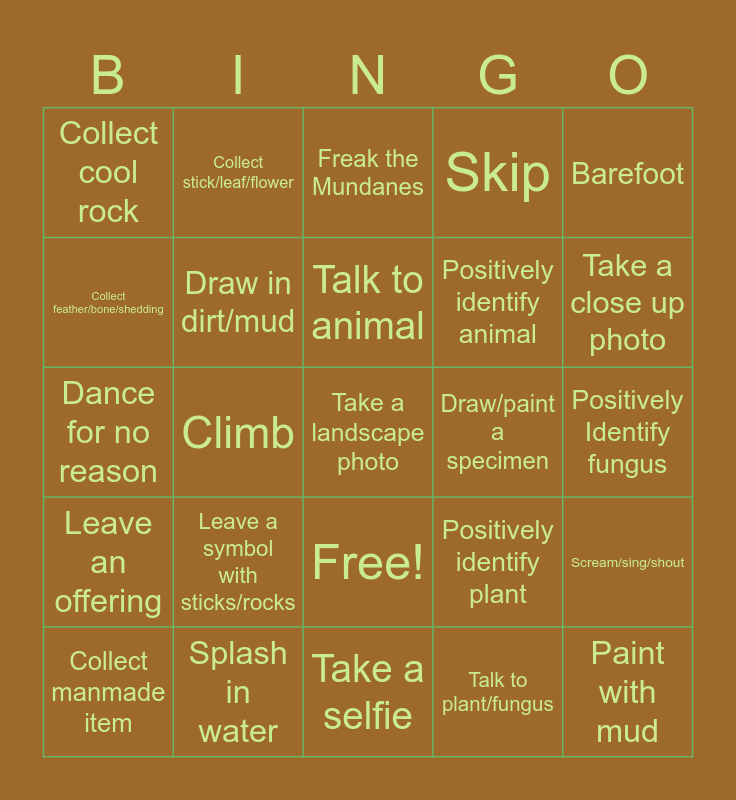 This bingo card has 26 words: Free!, Talk to plant/fungus, Talk to animal, Splash in water, Barefoot, Collect cool rock, Collect feather/bone/shedding, Collect stick/leaf/flower, Positively Identify fungus, Positively identify plant, Positively identify animal, Dance for no reason, Scream/sing/shout, Collect manmade item, Climb, Break into sprint, Skip, Leave an offering, Freak the Mundanes, Take a landscape photo, Take a close up photo, Take a selfie, Draw/paint a specimen, Leave a symbol with sticks/rocks, Draw in dirt/mud and Paint with mud.