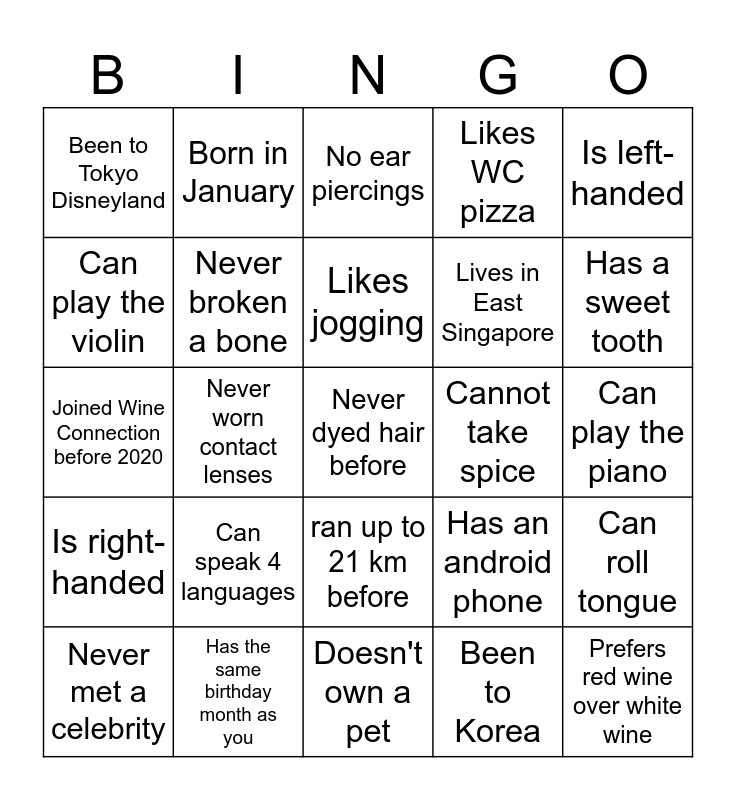 This bingo card has 25 words: Can speak 4 languages, Doesn't own a pet, Likes jogging, Never met a celebrity, Is left-handed, Been to Tokyo Disneyland, Can play the violin, Born in January, Cannot take spice, ran up to 21 km before, Lives in East Singapore, Joined Wine Connection before 2020, Has an android phone, Can roll tongue, Never broken a bone, Prefers red wine over white wine, Can play the piano, No ear piercings, Has a sweet tooth, Never worn contact lenses, Never dyed hair before, Has the same birthday month as you, Is right- handed, Likes WC pizza and Been to Korea.