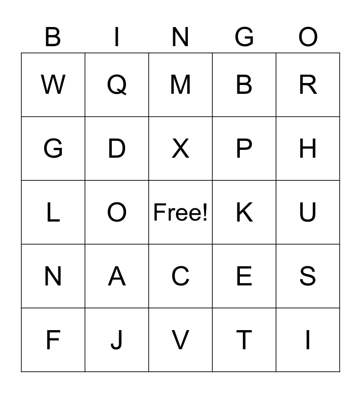 This bingo card has a free space and 24 words: A, J, X, F, R, W, G, Q, K, C, P, L, E, S, D, T, U, M, H, O, I, N, B and V.