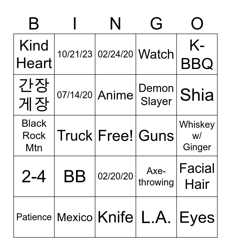 This bingo card has a free space and 24 words: BB, Mexico, Anime, Patience, K-BBQ, Kind Heart, 간장게장, 10/21/23, Guns, 02/20/20, Demon Slayer, Black Rock Mtn, Axe-throwing, Facial Hair, 07/14/20, L.A., Whiskey w/ Ginger, 02/24/20, Shia, Truck, Eyes, 2-4, Watch and Knife.