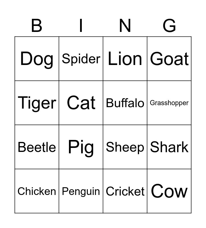 This bingo card has 16 words: Penguin, Shark, Lion, Dog, Beetle, Spider, Sheep, Cricket, Tiger, Cat, Chicken, Goat, Pig, Grasshopper, Buffalo and Cow.