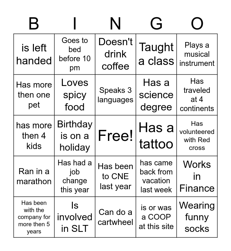 This bingo card has a free space and 24 words: Has had a job change this year, Is involved in SLT, Speaks 3 languages, Has been with the company for more then 5 years, Plays a musical instrument, is left handed, Has more then one pet, Goes to bed before 10 pm, Has a tattoo, Has been to CNE last year, Has a science degree, has more then 4 kids, has came back from vacation last week, Works in Finance, Loves spicy food, is or was a COOP at this site, Has volunteered with Red cross, Doesn't drink coffee, Has traveled at 4 continents, Birthday is on a holiday, Wearing funny socks, Ran in a marathon, Taught a class and Can do a cartwheel.
