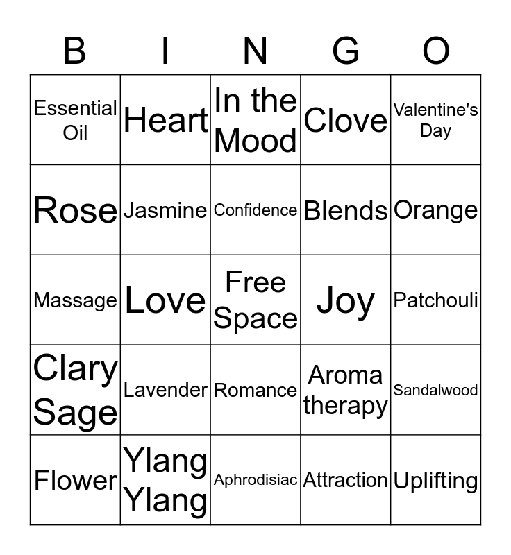 This bingo card has a free space and 24 words: Lavender, Ylang Ylang, Confidence, Flower, Valentine's Day, Essential Oil, Rose, Heart, Joy, Romance, Blends, Massage, Aroma therapy, Sandalwood, Jasmine, Attraction, Patchouli, In the Mood, Orange, Love, Uplifting, Clary Sage, Clove and Aphrodisiac.