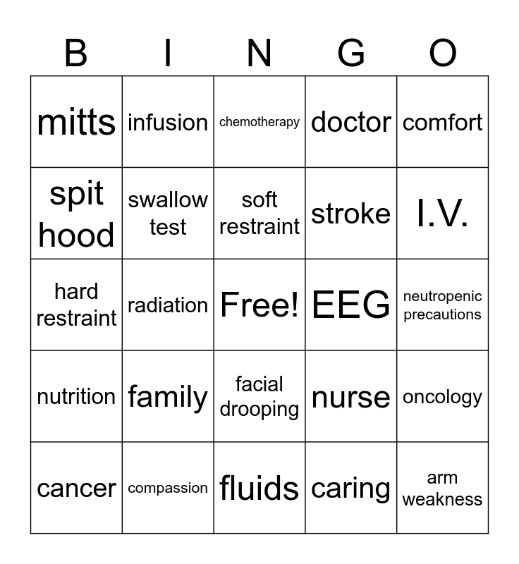 This bingo card has a free space and 45 words: 911, arm weakness, brain injury, cancer, care, caring, chemotherapy, Code Green, comfort, compassion, doctor, EEG, facial drooping, family, FAST, fluids, Gilda's Club, hard restraint, hope, I.V., infusion, liquids, loss of coordination, mitts, neurology, neutropenic precautions, NIH Stroke Scale, numbness, nurse, nutrition, oncologist, oncology, pain, PICC line, port, radiation, security, seizure, slurred speech, soft restraint, spit hood, stroke, support, swallow test and time.