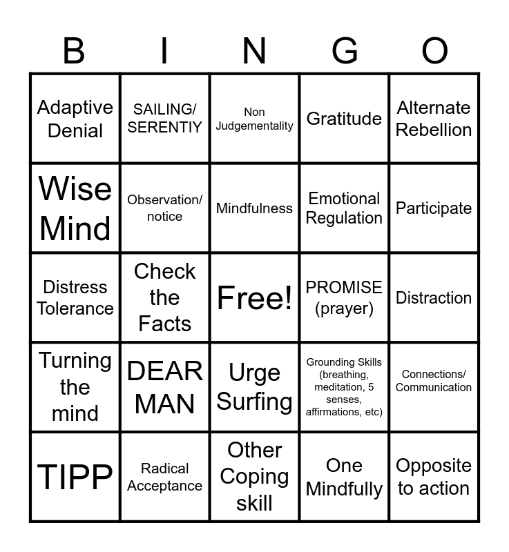 This bingo card has a free space and 24 words: DEAR MAN, Radical Acceptance, Mindfulness, TIPP, Alternate Rebellion, Adaptive Denial, Wise Mind, SAILING/ SERENTIY, PROMISE (prayer), Urge Surfing, Emotional Regulation, Distress Tolerance, Grounding Skills (breathing, meditation, 5 senses, affirmations, etc), Connections/ Communication, Observation/ notice, One Mindfully, Distraction, Non Judgementality, Participate, Check the Facts, Opposite to action, Turning the mind, Gratitude and Other Coping skill.