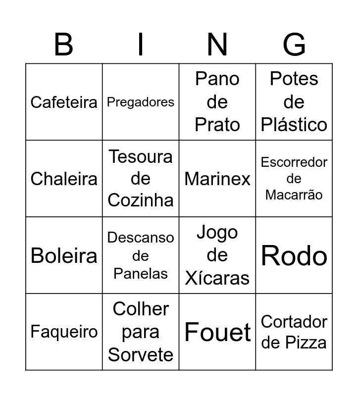 This bingo card has 27 words: Garrafa Térmica, Ralador, Boleira, Taças de Vinho, Tesoura de Cozinha, Pano de Prato, Pregadores, Cortador de Pizza, Colher para Sorvete, Forma de Pizza, Jogo de Xícaras, Potes de Plástico, Rodo de Pia, Copos, Descanso de Panelas, Saladeiro, Marinex, Escorredor de Macarrão, Copo de medidas, Cafeteira, Fouet, Vassoura, Rodo, Faqueiro, Forminha de gelo, Chaleira and Mixer.