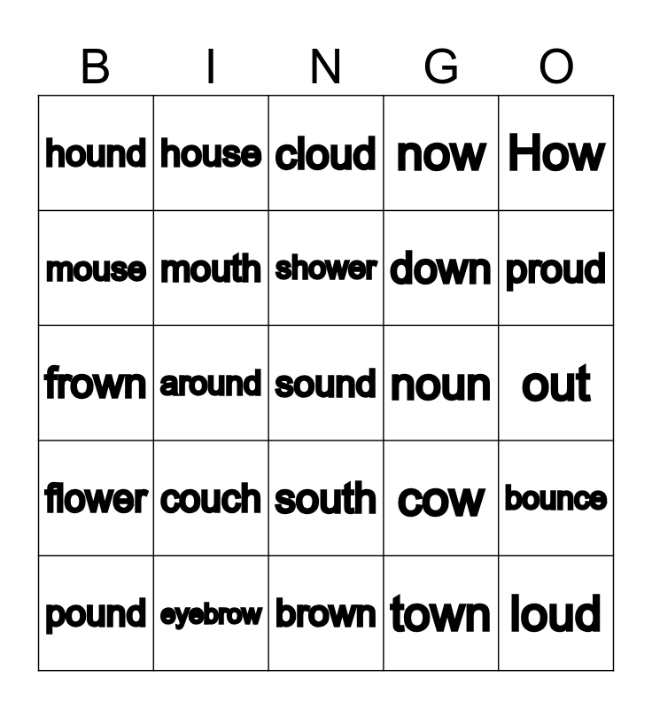 This bingo card has 25 words: couch, brown, shower, pound, How, hound, mouse, house, noun, south, down, frown, cow, bounce, mouth, loud, out, cloud, proud, around, sound, eyebrow, flower, now and town.