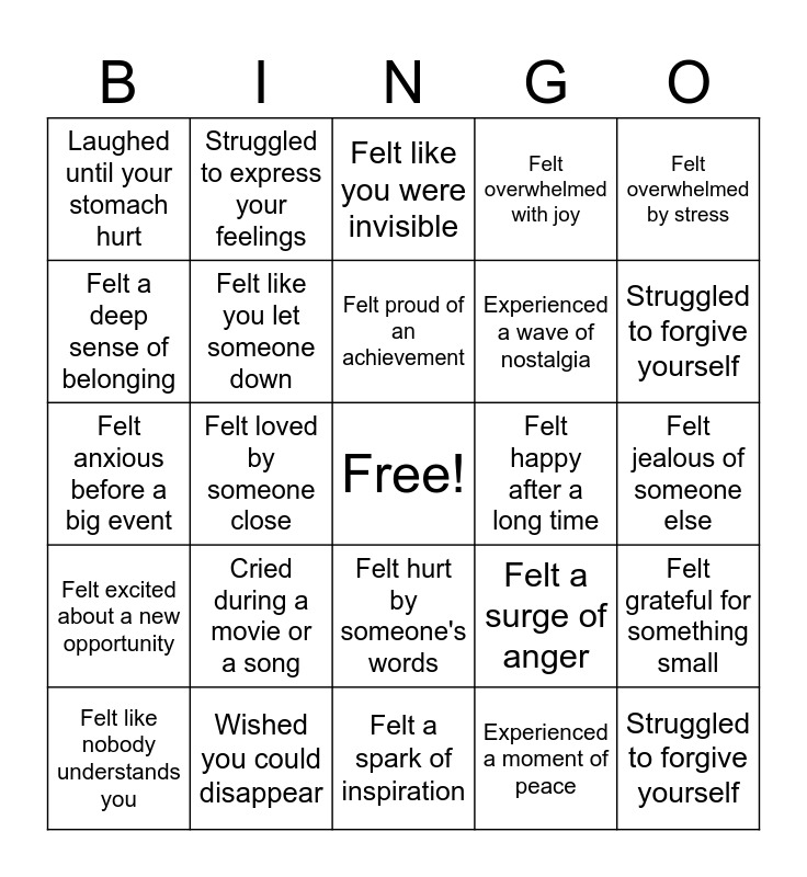 This bingo card has a free space and 24 words: Cried during a movie or a song, Wished you could disappear, Felt proud of an achievement, Felt like nobody understands you, Felt overwhelmed by stress, Laughed until your stomach hurt, Felt a deep sense of belonging, Struggled to express your feelings, Felt happy after a long time, Felt hurt by someone's words, Experienced a wave of nostalgia, Felt anxious before a big event, Felt a surge of anger, Felt grateful for something small, Felt like you let someone down, Experienced a moment of peace, Felt jealous of someone else, Felt like you were invisible, Struggled to forgive yourself, Felt loved by someone close, Struggled to forgive yourself, Felt excited about a new opportunity, Felt overwhelmed with joy and Felt a spark of inspiration.