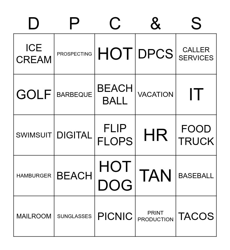 This bingo card has 37 words: Free!, AIR CONDITION, AUGUST, BARBEQUE, BASEBALL, BEACH, BEACH BALL, CAGING, CALLER SERVICES, DATA ENTRY, DIGITAL, DPCS, FLIP FLOPS, FOOD TRUCK, GOLF, HAMBURGER, HAT, HOT, HOT DOG, HR, ICE CREAM, IT, MAILROOM, PICNIC, POPSICLES, PRINT PRODUCTION, PROSPECTING, RAIN, SCHOOLS OUT, SUMMER, SUN, SUNGLASSES, SWIMSUIT, TACOS, TAN, VACATION and WAREHOUSE.