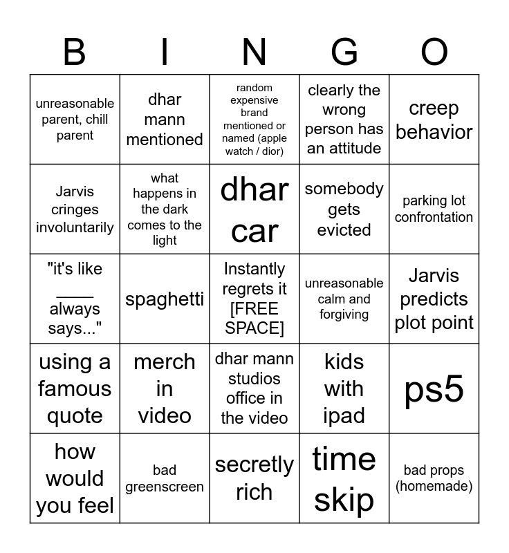 This bingo card has a free space and 42 words: dhar mann voiceover, dhar car, "you see" / "so you see", merch in video, time skip, ps5, bad props (homemade), flashback, random expensive brand mentioned or named (apple watch / dior), dhar mann studios office in the video, Jarvis predicts plot point, parking lot confrontation, spaghetti, creep behavior, oblivious parent with demon child, kids with ipad, cartoon supervillain, "it's like ____ always says...", continuity error, dhar mann mentioned, Jarvis cringes involuntarily, someone fired over something small, extreme coincidence, unreasonable parent, chill parent, bad voice dubbing, racist or sexist, somebody gets evicted, names to on the nose, husband is fired, inappropriate music, child with unrealistic emotional maturity, using a famous quote, what happens in the dark comes to the light, secretly rich, credit card declined, how would you feel, bad greenscreen, unreasonable calm and forgiving, random celeb, problematic lesson, clearly the wrong person has an attitude and creep.