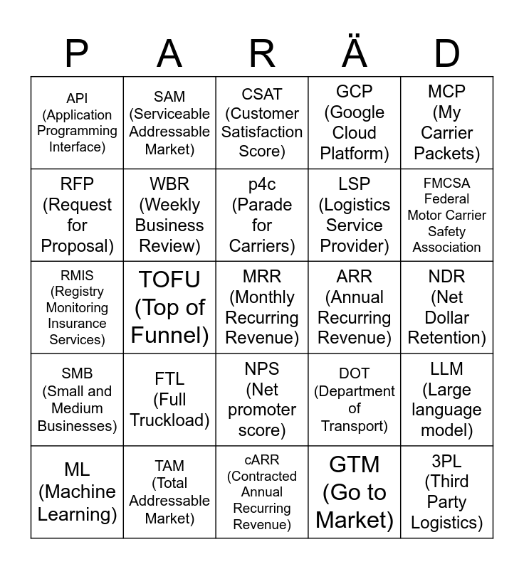 This bingo card has 30 words: TAM (Total Addressable Market), PLG (Product-Led Growth), TOFU (Top of Funnel), DFM (McLeod's Digital Freight Matching API), API (Application Programming Interface), CSAT (Customer Satisfaction Score), WBR (Weekly Business Review), NPS (Net promoter score), ARR (Annual Recurring Revenue), cARR (Contracted Annual Recurring Revenue), NDR (Net Dollar Retention), MRR (Monthly Recurring Revenue), GTM (Go to Market), 3PL (Third Party Logistics), FMCSA Federal Motor Carrier Safety Association, CDL (Commercial Driver's License), DOT (Department of Transport), SMB (Small and Medium Businesses), FTL (Full Truckload), MCP (My Carrier Packets), RMIS (Registry Monitoring Insurance Services), TMS (Transportation Management System), SAM (Serviceable Addressable Market), LSP (Logistics Service Provider), RFP (Request for Proposal), GCP (Google Cloud Platform), LLM (Large language model), ML (Machine Learning), p4c (Parade for Carriers) and NPS (Net Promoter Score).