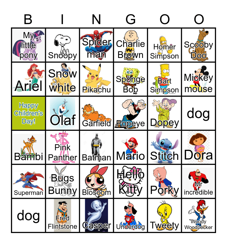 This bingo card has 34 images and 37 words: Bambi, Bugs Bunny, Casper, Charlie Brown, Dopey, Dora, My little pony, Fred Flintstone, Garfield, Hello Kitty, Homer Simpson, Mickey mouse, Ariel, Snow white, Batman, Popeye, Porky, Scooby Doo, Happy Children's Day!, Snoopy, Spider man, Sponge Bob, Stitch, Mr incredible, Superman, Pink Panther, Pikachu, Underdog, Tweety, Woody Woodpecker, Tom & Jerry, Olaf, Blosoom, Mario, Bart Simpson, dog and dog.