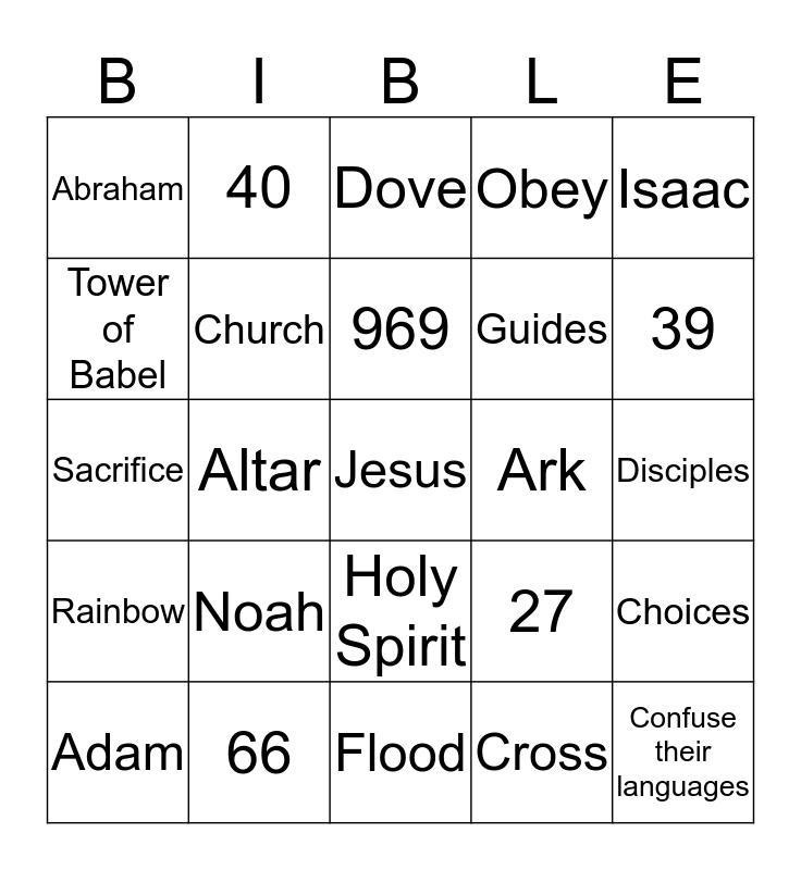 This bingo card has a free space and 24 words: Noah, 66, 969, Adam, Isaac, Abraham, Tower of Babel, 40, Ark, Holy Spirit, Guides, Sacrifice, 27, Choices, Church, Cross, Disciples, Dove, 39, Altar, Confuse their languages, Rainbow, Obey and Flood.