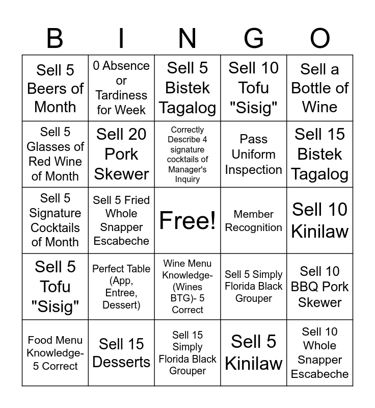 This bingo card has a free space and 24 words: Perfect Table (App, Entree, Dessert), Sell 15 Desserts, Correctly Describe 4 signature cocktails of Manager's Inquiry, Food Menu Knowledge- 5 Correct, Sell a Bottle of Wine, Sell 5 Beers of Month, Sell 5 Glasses of Red Wine of Month, 0 Absence or Tardiness for Week, Member Recognition, Wine Menu Knowledge- (Wines BTG)- 5 Correct, Pass Uniform Inspection, Sell 5 Signature Cocktails of Month, Sell 5 Simply Florida Black Grouper, Sell 10 BBQ Pork Skewer, Sell 20 Pork Skewer, Sell 5 Kinilaw, Sell 10 Kinilaw, Sell 5 Bistek Tagalog, Sell 15 Bistek Tagalog, Sell 5 Fried Whole Snapper Escabeche, Sell 10 Whole Snapper Escabeche, Sell 5 Tofu "Sisig", Sell 10 Tofu "Sisig" and Sell 15 Simply Florida Black Grouper.