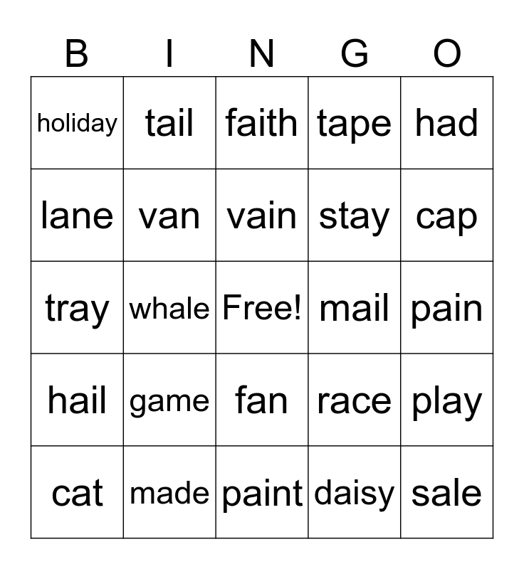 This bingo card has a free space and 29 words: cat, okay, whale, gas, holiday, faith, van, game, mail, made, pain, sale, paint, daisy, cap, chain, fan, hail, had, tray, race, plate, stay, lane, tape, tail, play, vain and shake.