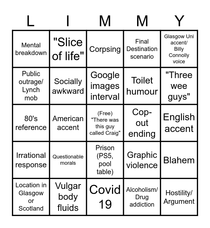 This bingo card has a free space and 34 words: Dysfunctional relationship, Alcoholism/ Drug addiction, Supernatural themes, Celebrity encounter, Irrational response, Socially awkward, Glasgow Uni accent/ Billy Connolly voice, Location in Glasgow or Scotland, "Slice of life", Close up face transition, Google images interval, Corpsing, Cartoon logic, "And how did I know it was true?", Cop-out ending, "Three wee guys", Vulgar body fluids, 80's reference, Questionable morals, Graphic violence, Prison (PS5, pool table), "Mary" "John", Mental breakdown, English accent, Covid 19, Hostility/ Argument, Final Destination scenario, "Erm, what?" voice, Toilet humour, Public outrage/ Lynch mob, Scottish policeman voice "Umm under section 13", American accent, Blahem and Flash of knives.