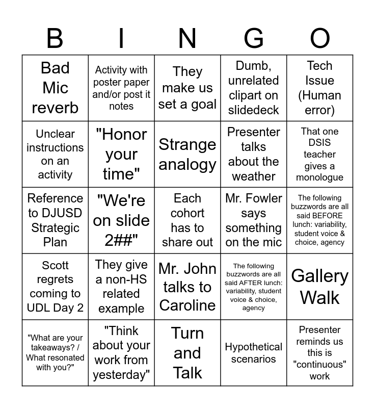 This bingo card has 25 words: They give a non-HS related example, Turn and Talk, Strange analogy, "What are your takeaways? / What resonated with you?", Tech Issue (Human error), Bad Mic reverb, Unclear instructions on an activity, Activity with poster paper and/or post it notes, Mr. Fowler says something on the mic, Mr. John talks to Caroline, Presenter talks about the weather, Reference to DJUSD Strategic Plan, The following buzzwords are all said AFTER lunch: variability, student voice & choice, agency, Gallery Walk, "Honor your time", Presenter reminds us this is "continuous" work, The following buzzwords are all said BEFORE lunch: variability, student voice & choice, agency, They make us set a goal, That one DSIS teacher gives a monologue, "We're on slide 2##", Each cohort has to share out, "Think about your work from yesterday", Scott regrets coming to UDL Day 2, Dumb, unrelated clipart on slidedeck and Hypothetical scenarios.