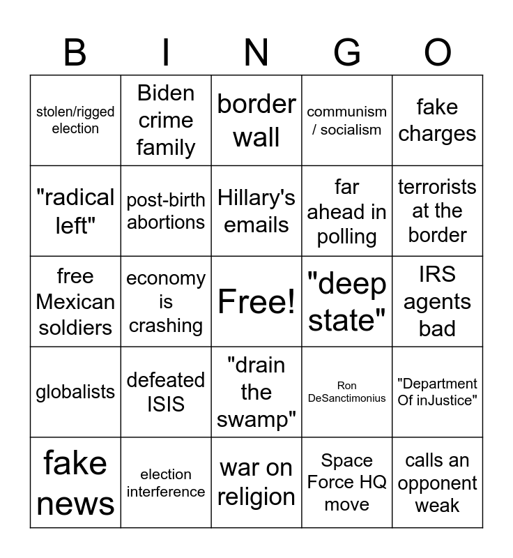 This bingo card has a free space and 24 words: defeated ISIS, election interference, Hillary's emails, fake news, fake charges, stolen/rigged election, "radical left", Biden crime family, "deep state", "drain the swamp", far ahead in polling, free Mexican soldiers, Ron DeSanctimonius, "Department Of inJustice", post-birth abortions, Space Force HQ move, IRS agents bad, border wall, terrorists at the border, economy is crashing, calls an opponent weak, globalists, communism / socialism and war on religion.