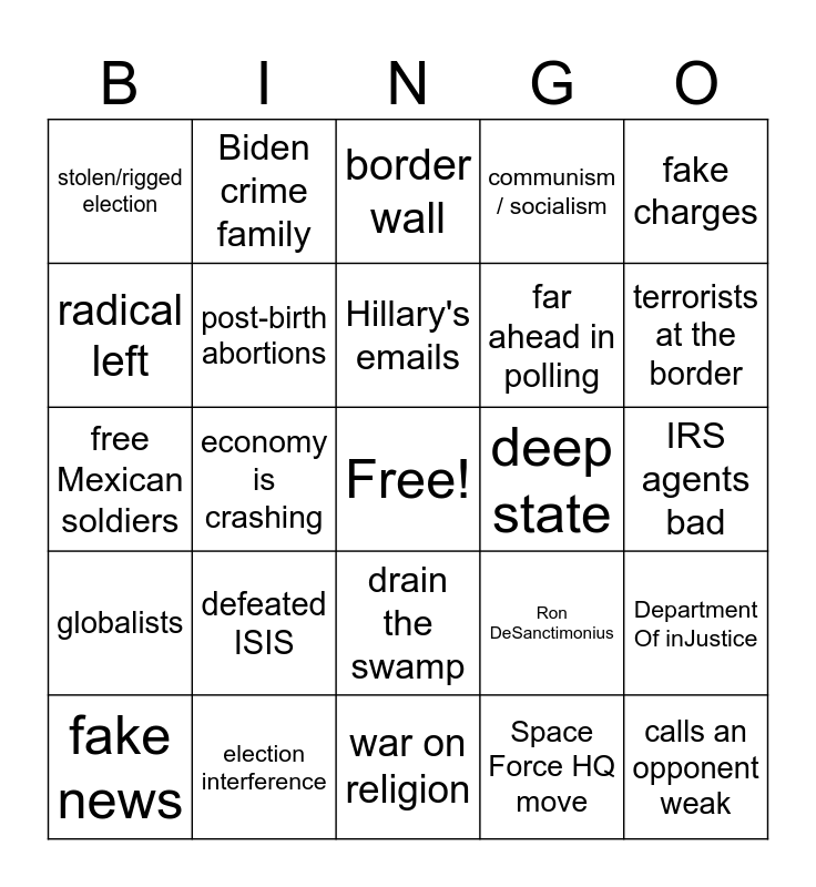 This bingo card has a free space and 24 words: defeated ISIS, election interference, Hillary's emails, fake news, fake charges, stolen/rigged election, radical left, Biden crime family, deep state, drain the swamp, far ahead in polling, free Mexican soldiers, Ron DeSanctimonius, Department Of inJustice, post-birth abortions, Space Force HQ move, IRS agents bad, border wall, terrorists at the border, economy is crashing, calls an opponent weak, globalists, communism / socialism and war on religion.
